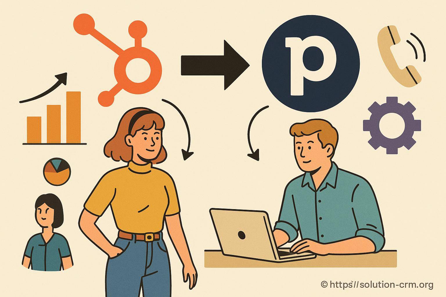 Cette illustration dynamique met en scène l'intégration entre deux outils majeurs de gestion commerciale et marketing : HubSpot et Pipedrive. À gauche, une femme souriante représente l'utilisation de HubSpot, symbolisé par son logo orange distinctif, entouré d'éléments graphiques comme des statistiques en hausse et des diagrammes circulaires, témoignant de l'analyse et du suivi des performances marketing.